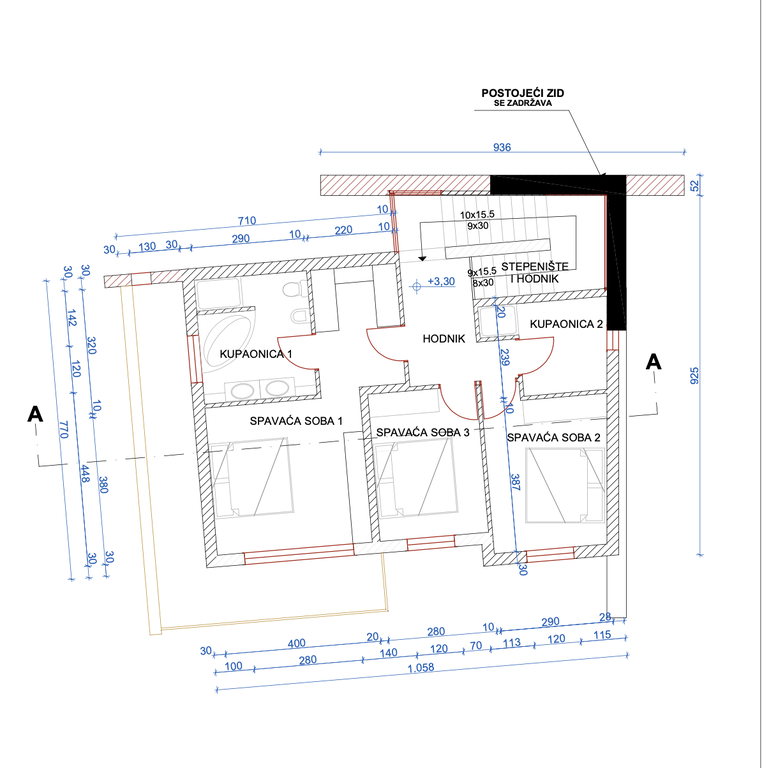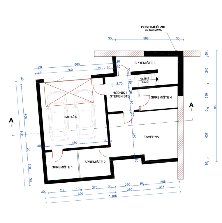 The building’s staircase level is planned to include four separate rooms, including a tavern and a garage. In addition, three parking spaces are planned on the parcel. The ground floor is planned as a living area, while the upper floor is designed as a night area with three bedrooms and two bathrooms. The building also includes terraces on the ground and upper floors, oriented to the northwest, providing outdoor connection and pleasant lighting.