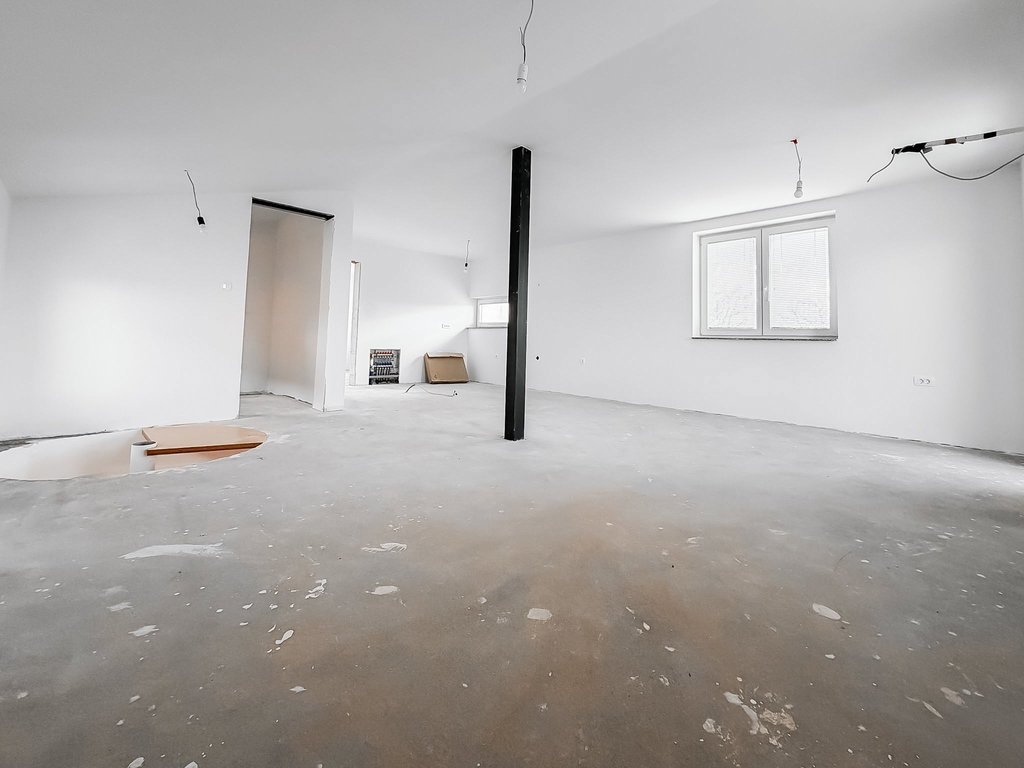 The upper floor is planned to have a larger living area with installations for a kitchen, which can be arranged into up to three additional rooms by agreement with the investor. This floor also includes a bathroom and a bedroom with a walk-in closet and access to a balcony that offers an open view of nature.