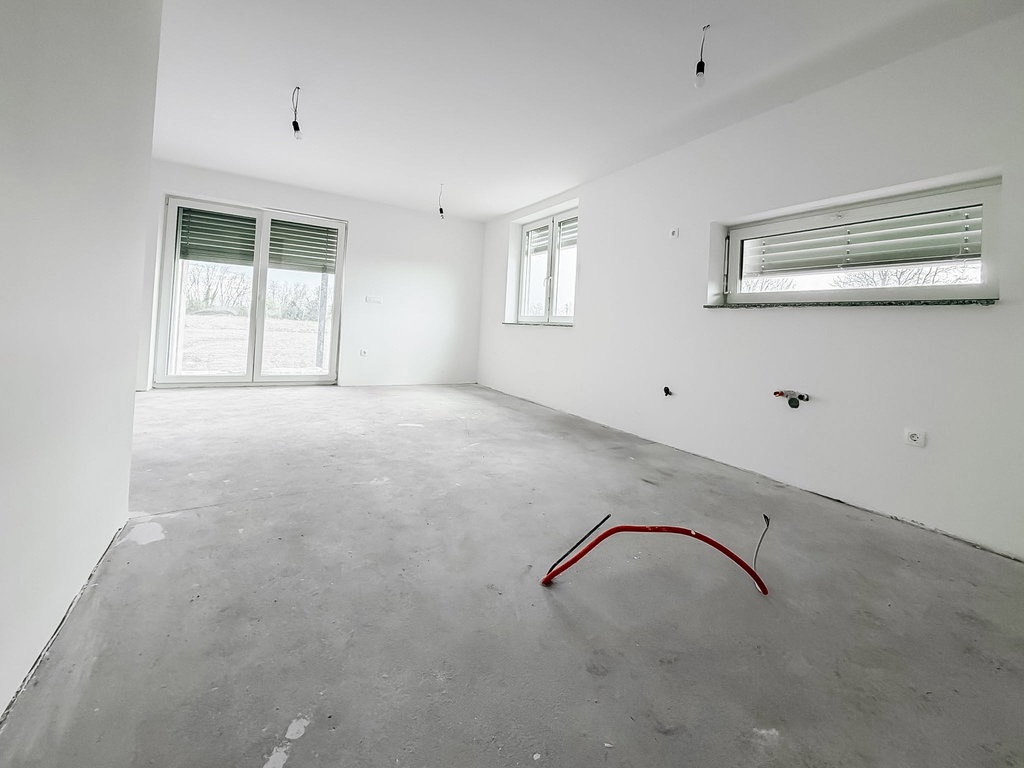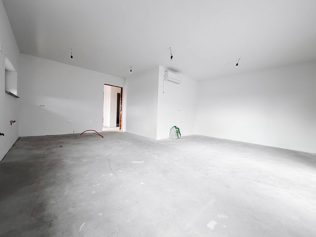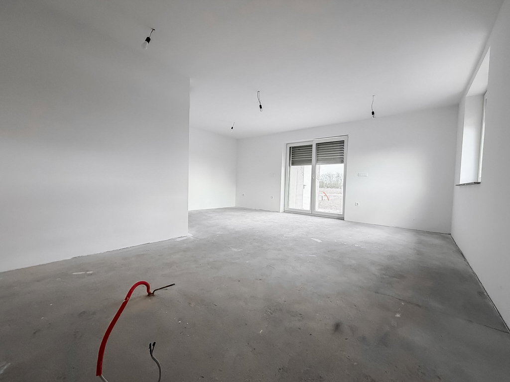 The house is built with quality and energy efficiency in mind. A 20 cm thick insulated facade is planned, PVC windows and doors are installed, with fabric blinds on the ground floor and shutters on the upper floor. Heating is provided via a heat pump with underfloor heating, and an air conditioning unit is also installed. The buyer is still able to choose the final flooring and interior doors at this stage, allowing customization of the property to personal preferences. The courtyard around the house will be landscaped and paved, and the access road to the property will be asphalted. Two parking spaces are guaranteed on the plot.