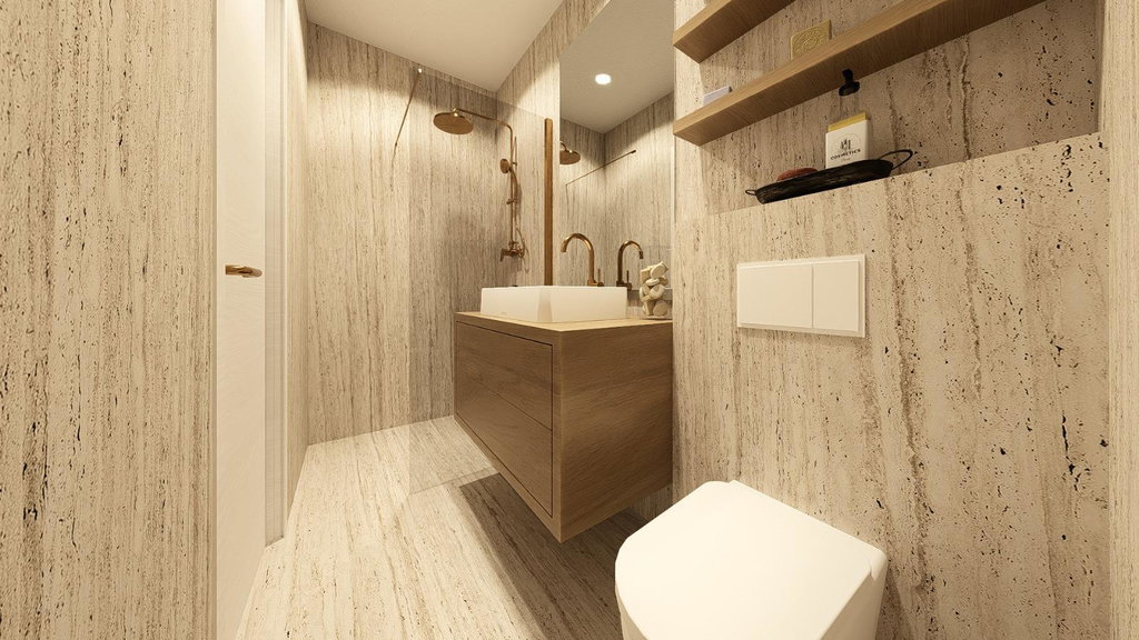 Apartment S3 is equipped with double-glazed Schüco windows and shutters. High-quality Marazzi tiles are installed in the bathrooms.