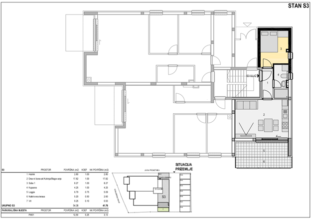 Apartment S3 with a size of 41.76 m2 is located on the ground floor and features a balcony/loggia and private garden, providing direct contact with nature and additional privacy.
