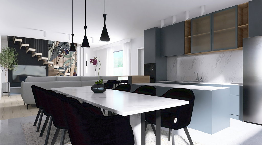 • Spacious open space living area connected to a modern kitchen and dining area, ideal for socializing,