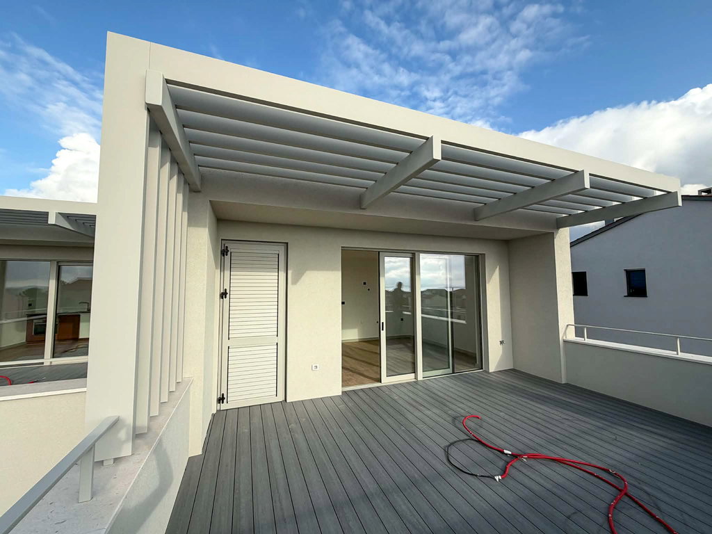 The house is built in energy class A and equipped with underfloor heating via a heat pump, inverter air conditioning units with six indoor units, and additional electric underfloor heating in the bathrooms. On the roof, there is a private photovoltaic power plant (3.4 kWp), which enables significantly lower operating costs and energy independence. It is fitted with high-quality aluminum joinery with insect screens and aluminum shutters; the entrance door is Inotherm, and all outdoor surfaces are executed in quality wooden decking. The landscaped and fenced garden ensures complete privacy.