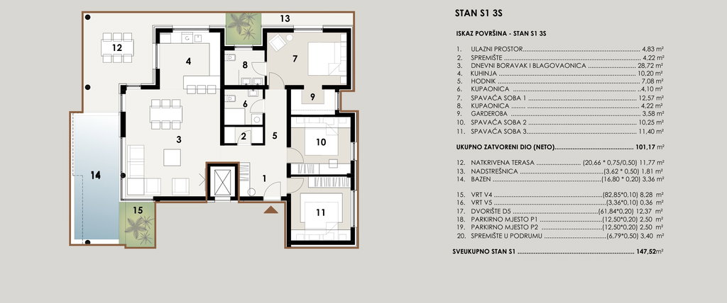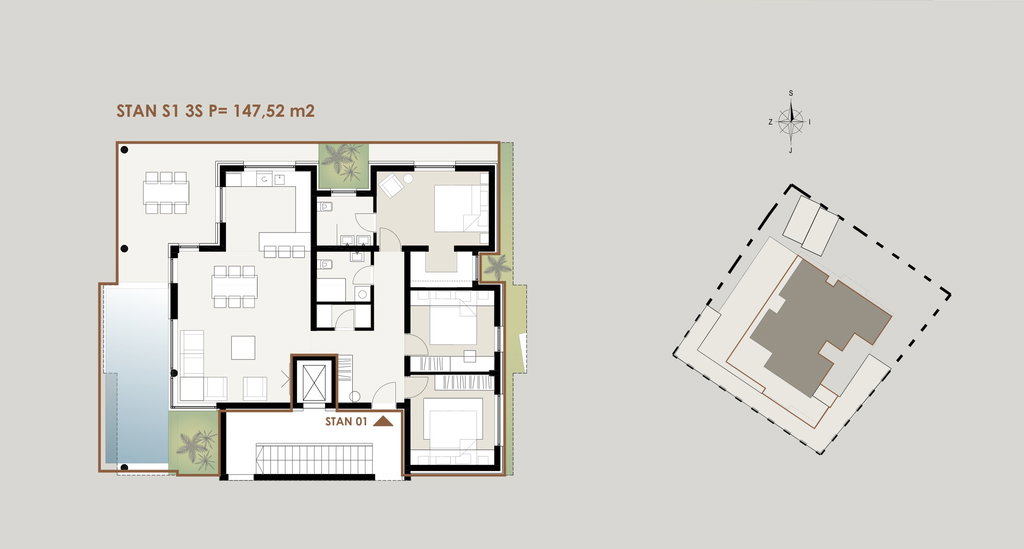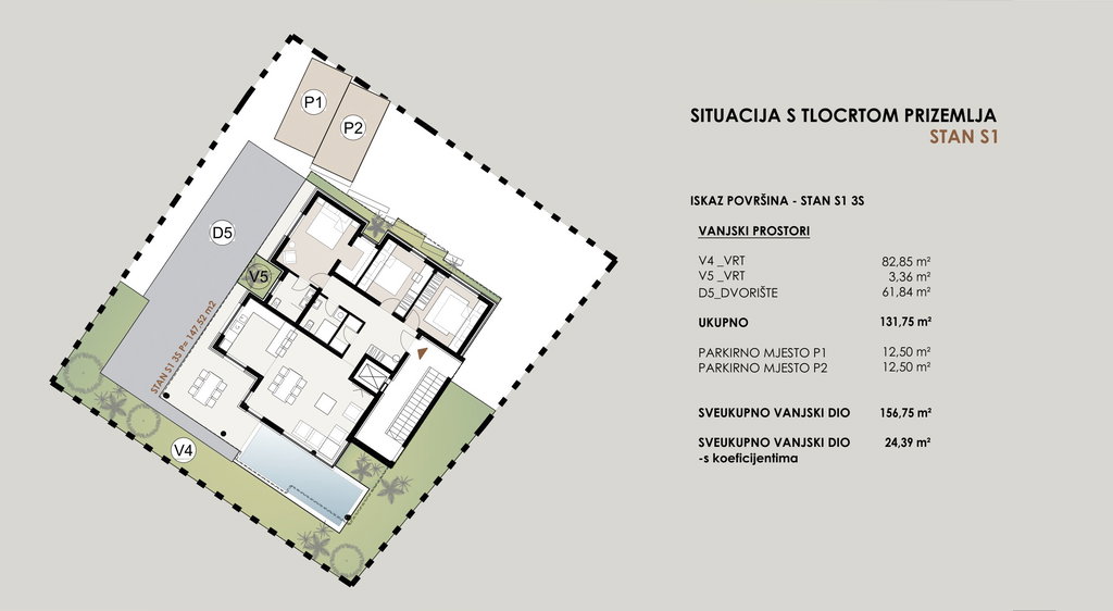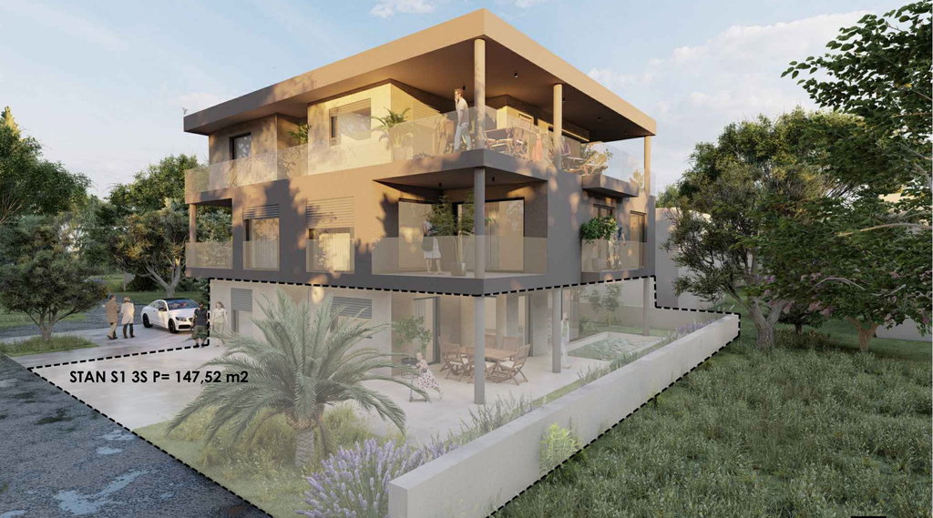 The apartment labeled S1 has 101.17 m2 of net floor area, located on the ground floor of a modernly designed multi-residential building, the construction of which has already begun. The building is contemporary in design and includes an elevator. The apartment features a functional and clear layout, good orientation, and a pleasant connection between the interior spaces and the outdoor areas.