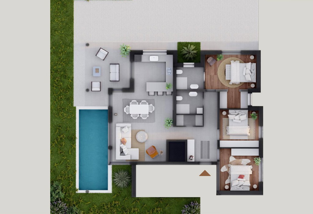 The apartment consists of a central area representing a spacious living room with kitchen and dining area, with an open and bright design. From the living room, there is access to a covered terrace, usable for most of the year; the continuation of the terrace is the courtyard and garden, which adds extra value to the apartment and allows for pleasant outdoor living.