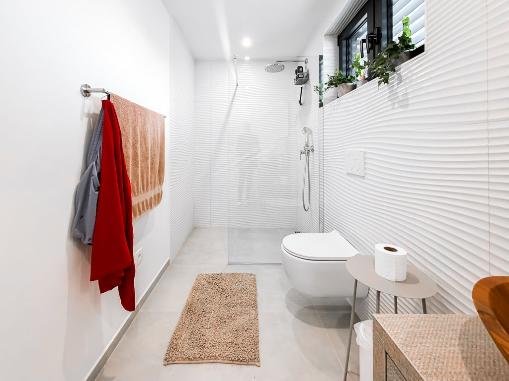 V nadstropju so štiri prostorne spalnice, vsaka s svojo lastno kopalnico z walk-in tušem, kakovostnimi armaturami in garderobnim prostorom. Iz nadstropja je dostop do večjega balkona, s katerega se odpira lep pogled na morje in zeleno okolico.