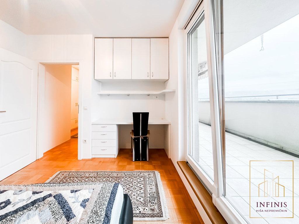 Tloris obsega hodnik, dnevno-bivalni prostor s kuhinjo in jedilnico ter izhodom na veliko teraso s prijetnim razgledom, večjo spalnico s kabinetom oziroma pisarno prav tako z izhodom na teraso ter kopalnico. Stanovanje je opremljeno in pripravljeno za vselitev.