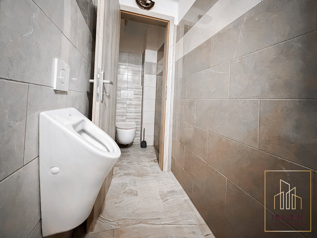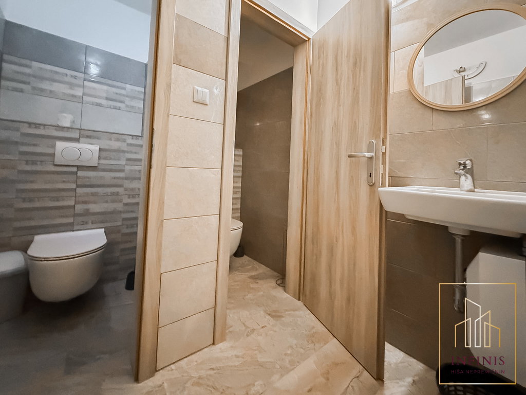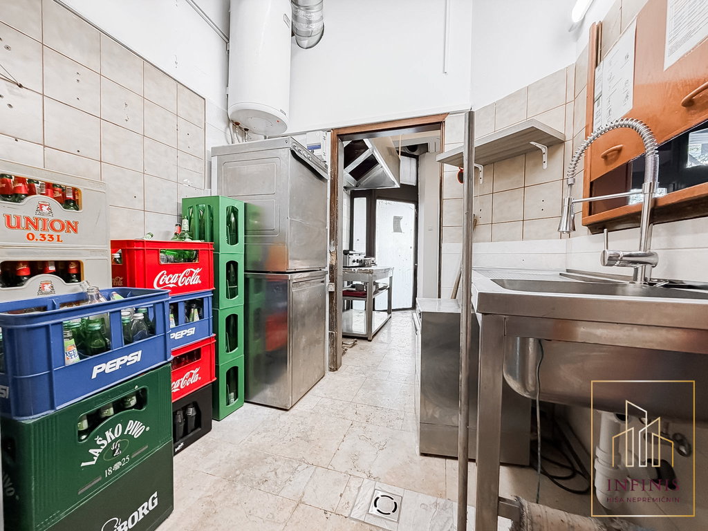 Poslovni prostor obsega skupno 177,6 m2 in je razporejen v dveh pol-etažah, kar ustvarja zanimiv in funkcionalen ambient. Osrednji del predstavlja večji odprt prostor za goste v dveh nivojih, ki omogoča prilagodljivo razporeditev glede na dejavnost. V sklopu lokala se nahajajo še kuhinja, ločene sanitarije za ženske in moške ter dodatne sanitarije za osebje z garderobo. V kletnem delu objekta je urejeno skladišče v velikosti z dostopom iz garaže, kjer se nahaja tudi lastniško parkirno mesto.