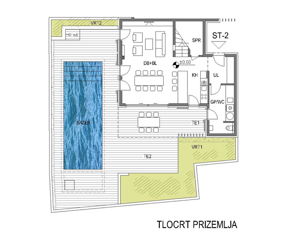 Hiša obsega tri etaže. V pritličju se nahaja vhodni del, gospodarski prostor z WC-jem ter velik odprt bivalni prostor, ki združuje dnevni del, jedilnico in kuhinjo. Iz dnevnega prostora je izhod na prostorno teraso, kjer je umeščen velik ogrevan bazen, dodatne zunanje površine in urejen vrt. Pred objektom sta zagotovljeni dve parkirni mesti, dostopna neposredno z dovozne poti.