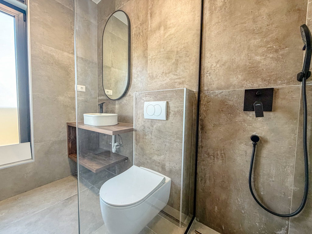 Stanovanje se nahaja v 1. nadstropju in meri 105,50 m2 neto oziroma 118,89 m2 bruto in je zasnovano izredno funkcionalno. Razporeditev obsega hodnik, tri udobne spalnice, dve kopalnici (ena pripada glavni spalnici), ter odprt bivalni del s kuhinjo, jedilnico in dnevno sobo. Posebna prednost stanovanja so velike panoramske steklene površine, ki zagotavljajo obilico naravne svetlobe in občutek dodatne prostornosti.